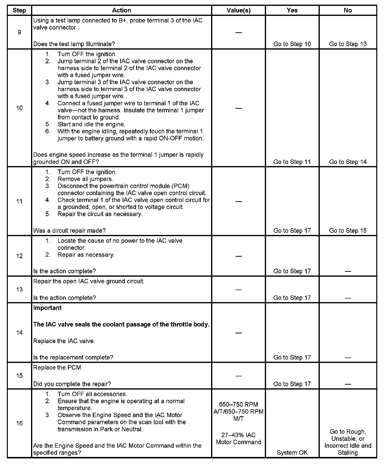 10. This step simulates the pulse width modulated (PWM) signal supplied to the IAC valve by the PCM by rapidly grounding and ungrounding terminal 1 of the IAC valve.