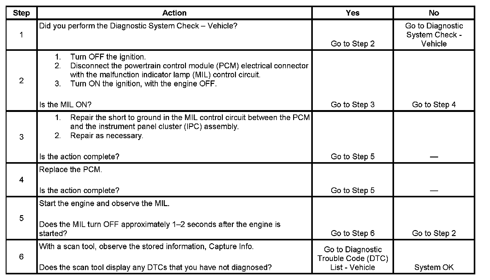 - Check for a shorted MIL control circuit between the PCM and the instrument panel cluster (IPC) assembly.