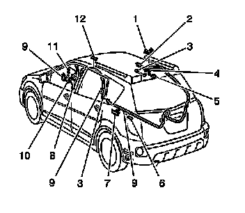9. Pull the rear edge of the headliner down to gain access to the rear washer hose (9).