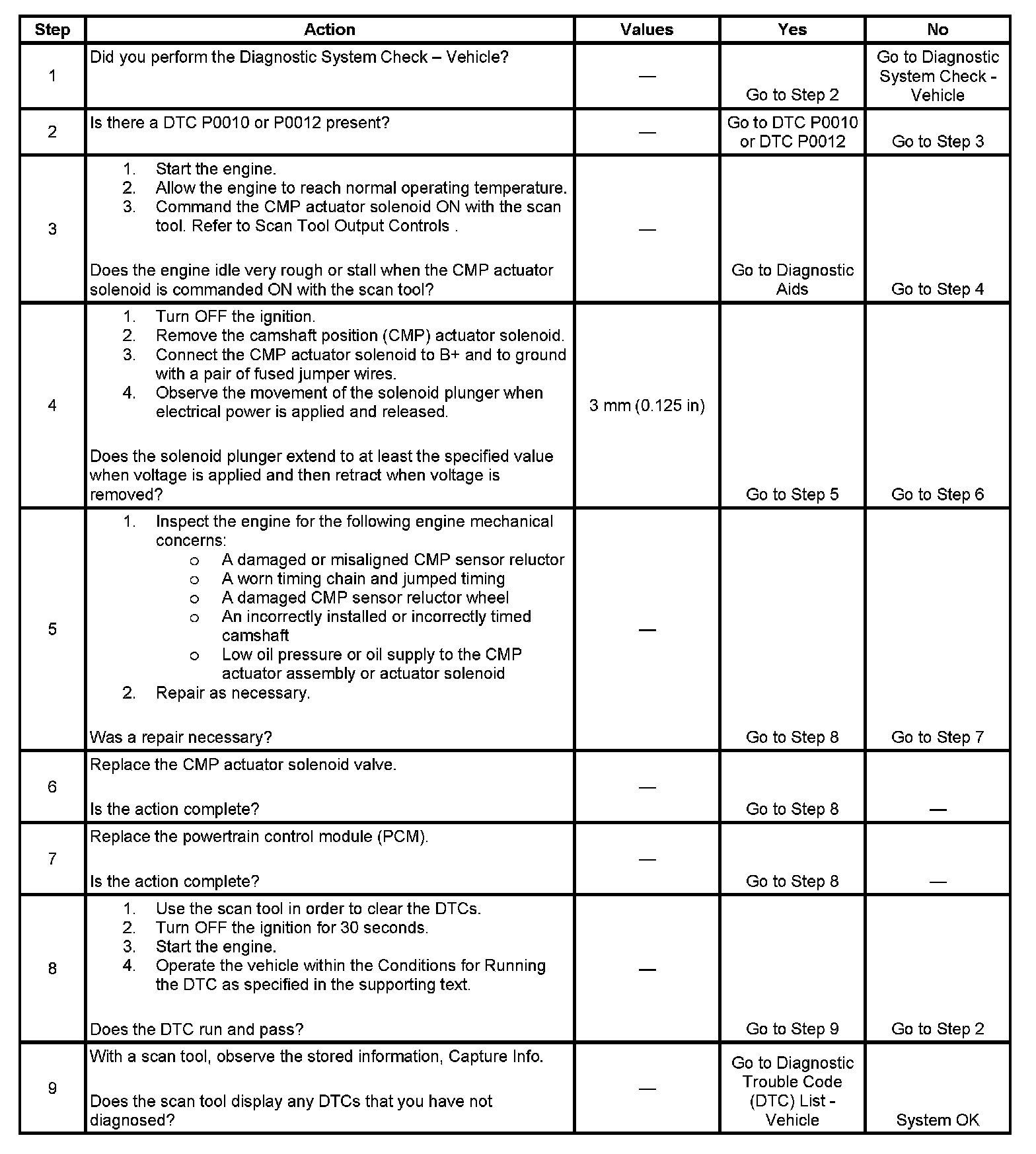 3. This step checks the operation of the CMP actuator system. When commanded ON, the CMP actuator solenoid advances the camshaft, usually causing the engine to stall.