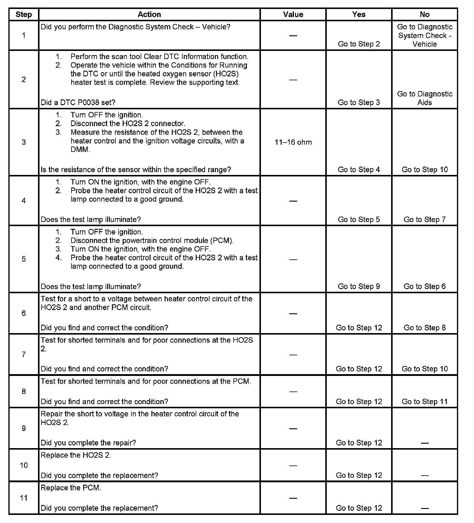 - The HO2S heater diagnostic checks for many of the faults that can cause DTC P0038 to set. If the HO2S heater test passes, the cause of the DTC is probably intermittent. Clear the DTC information. Road test the vehicle while monitoring the HO2S heater test in the I/M System Information selection on the scan tool. When the HO2S heater test indicates complete with a YES status, check for a DTC P0038 under Last Test Failed. If there is no DTC P0038 indicated, the DTC is intermittent and the HO2S heater diagnostic is indicating OK at this time.