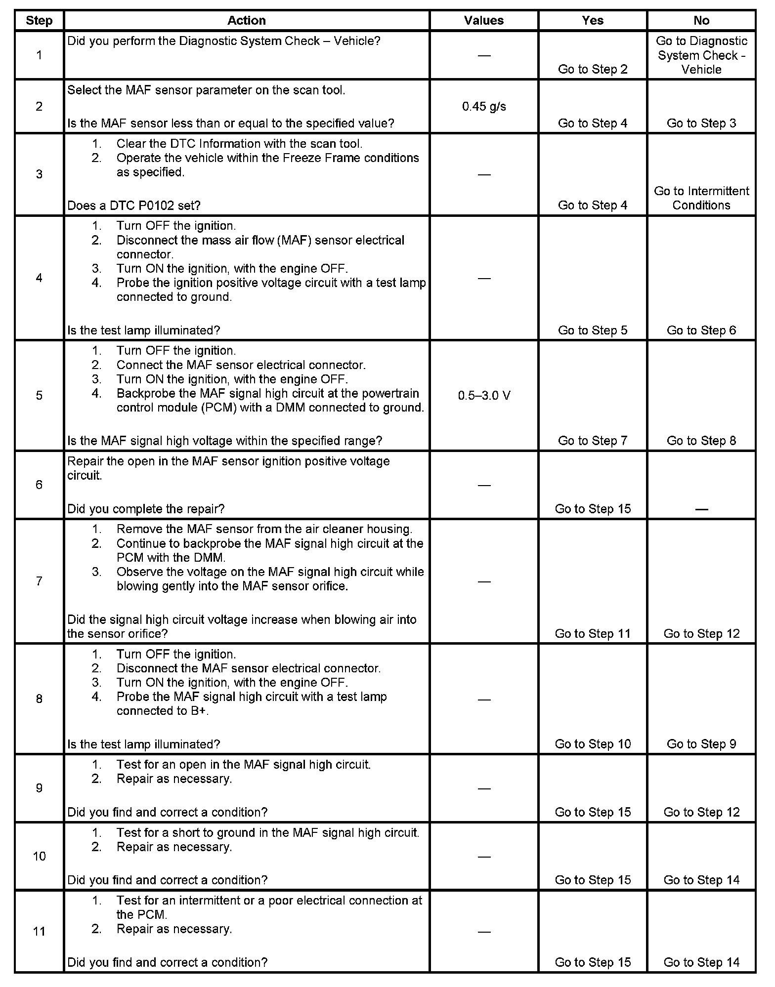 The DTC P0102 Mass Air Flow (MAF) Sensor Circuit Low Voltage diagnostic detects an out of range sensor signal. The MAF sensor measures the changes in the intake air volume that result from the changes in throttle opening and air density. Air flow measurements are used by the powertrain control module (PCM) in order to determine engine fueling requirements.