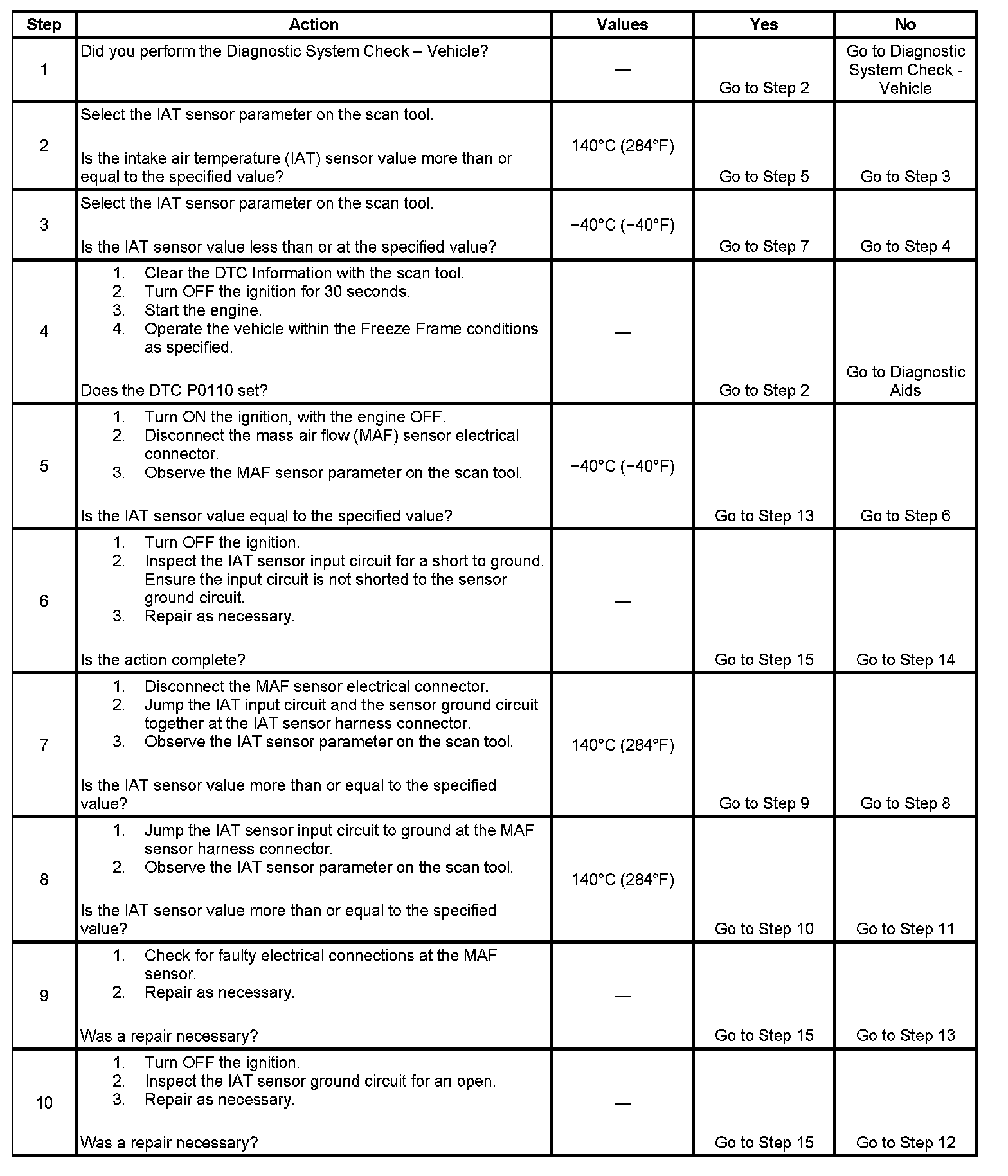 Use the Temperature vs Resistance table in order to evaluate the possibility of a shifted IAT sensor. A shifted sensor could result in a DTC P0110. Refer to Temperature vs Resistance.