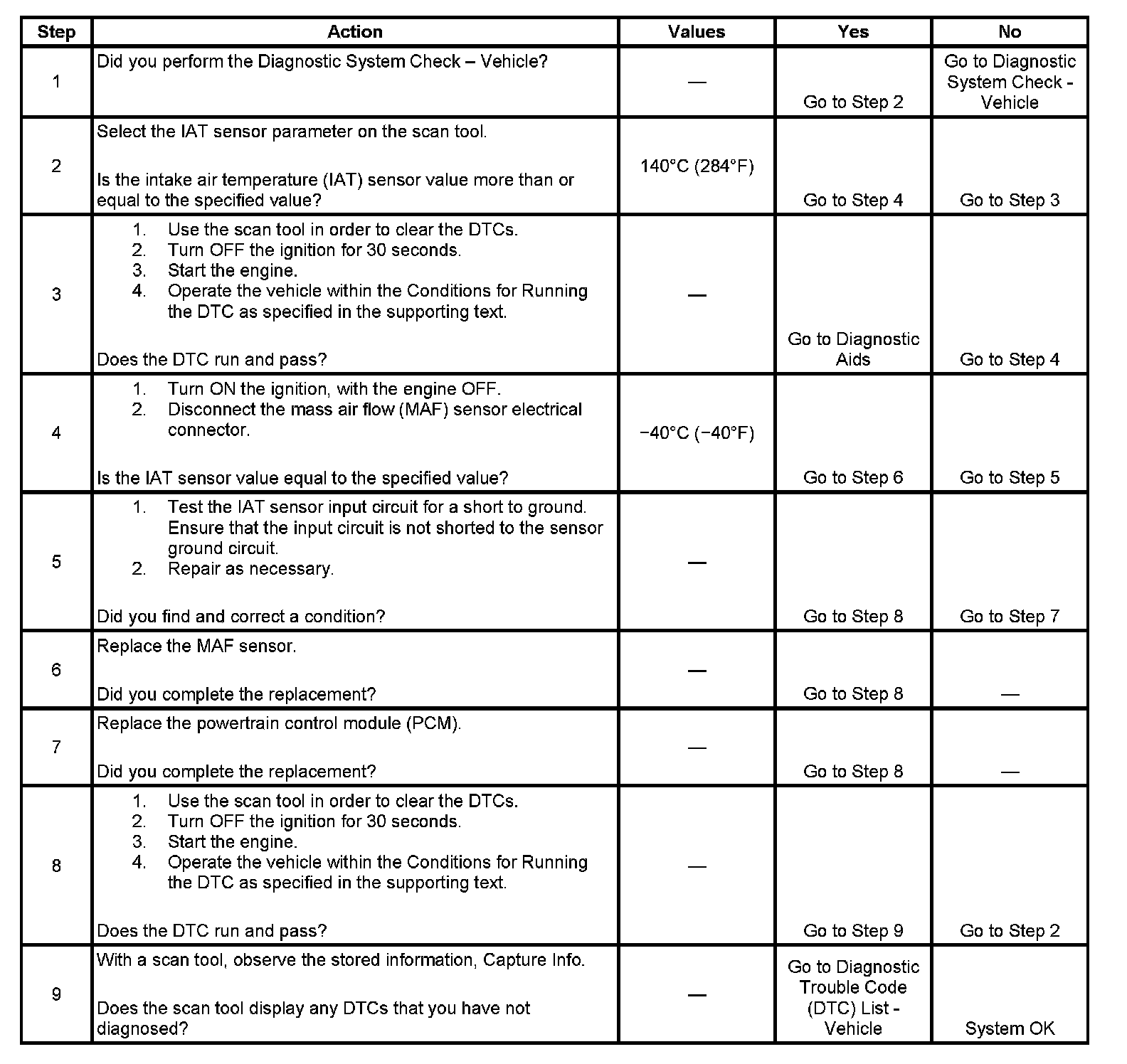 Use the Temperature vs Resistance table in order to evaluate the possibility of a shifted IAT sensor. A shifted sensor could result in a DTC P0112. Refer to Temperature vs Resistance.