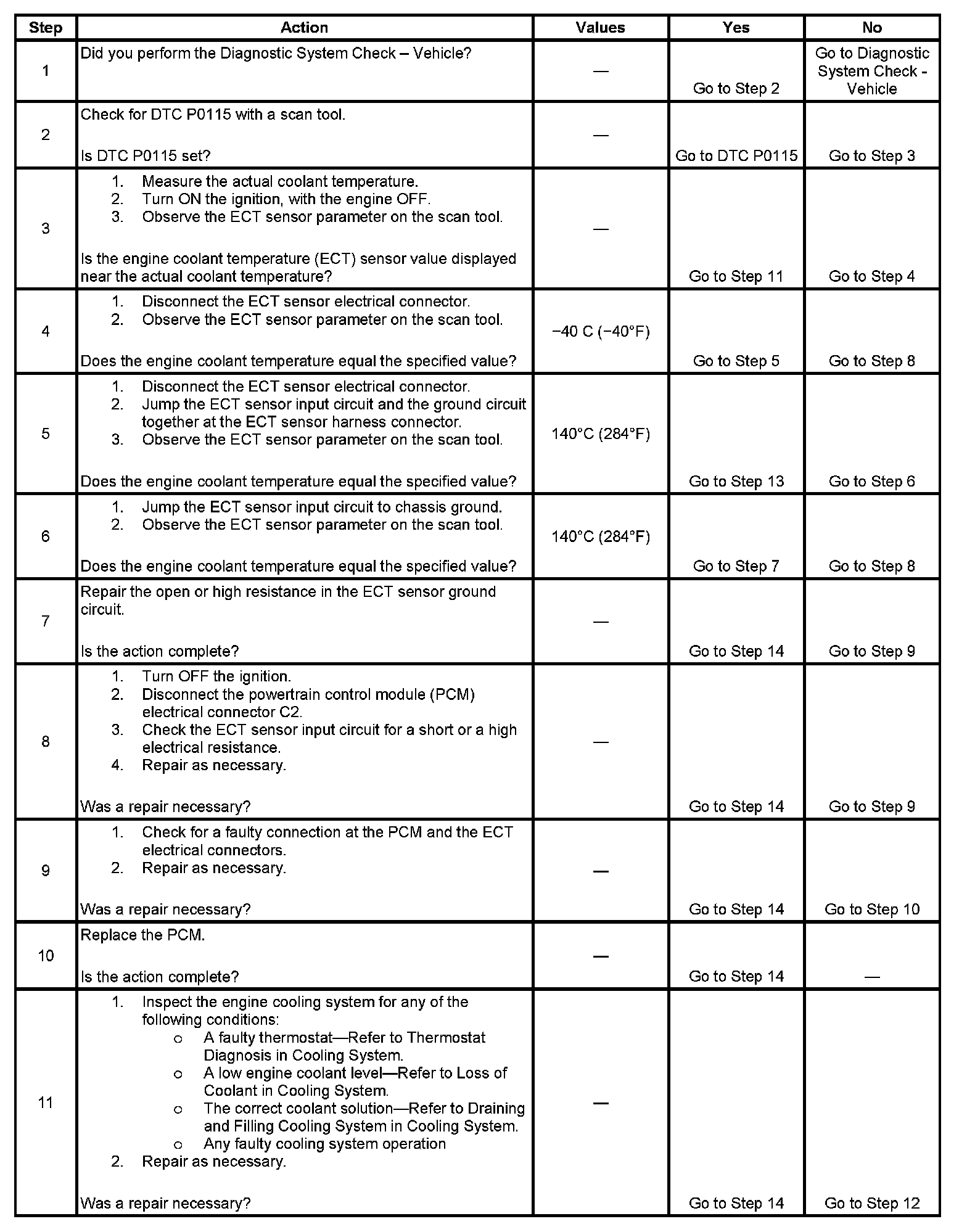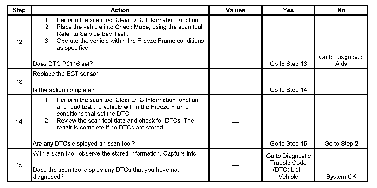 - If DTCs P0115 and P0116 are both set the ECT sensor circuit may be open or shorted. Perform the DTC P0115 diagnostic table first. P0115