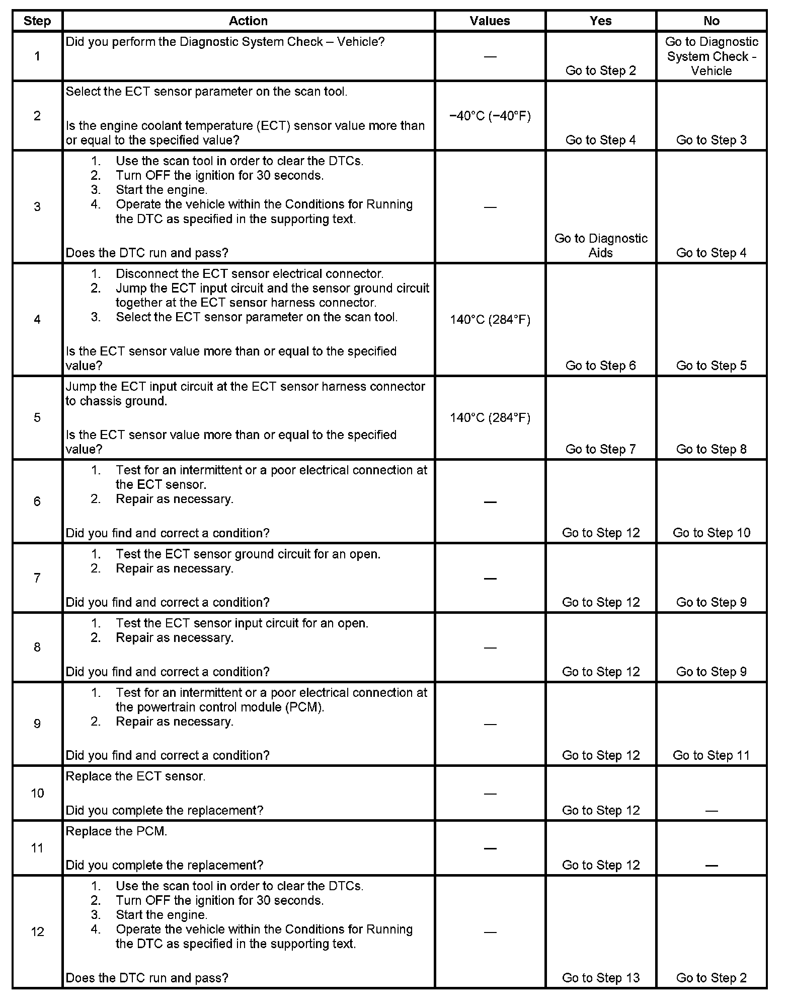- Use the Temperature vs Resistance table in order to evaluate the possibility of a shifted ECT sensor. A shifted sensor could result in a DTC P0118. Refer to Temperature vs Resistance.