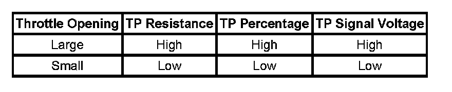 The DTC P0121 Throttle Position (TP) Sensor Performance diagnostic monitors the sensor activity. The TP sensor is a potentiometer whose resistance value changes along with the throttle valve position. The powertrain control module (PCM) provides a 5-Volt reference voltage to the TP sensor. The PCM reads the voltage across the TP sensor and uses the voltage to calculate the percentage of throttle valve opening. The TP sensor resistance decreases as the throttle valve opening increases. When the TP sensor resistance decreases the voltage being monitored by the PCM increases. The TP sensor resistance increases when the throttle valve opening decreases, therefore the voltage being monitored by the PCM will decrease.