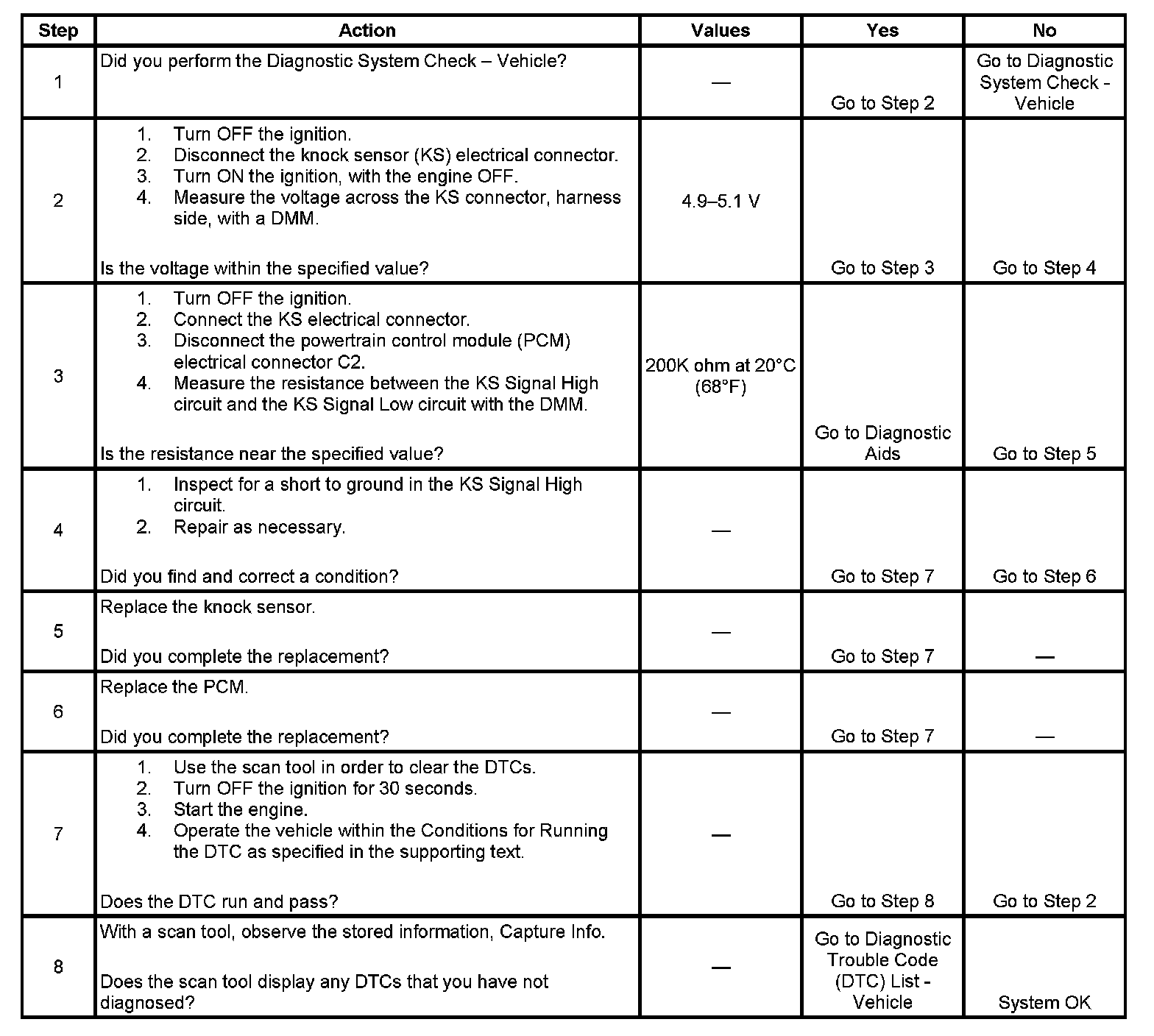 The DTC P0327 Knock Sensor (KS) Circuit Low Frequency diagnostic monitors the activity on the knock sensor circuit. The KS is non-resonant design that is constructed of a piezoelectric element which generates an AC signal, when vibrated. Normal engine operation will cause the KS to generate signals of known frequencies. When engine knock is present, the KS frequency changes. This signals the powertrain control module (PCM) to retard ignition timing. The PCM sends a bias voltage of 5 volts to the KS on the KS Signal High circuit. The PCM expects approximately 2.5 volts back on the KS Signal Low circuit. The KS generated AC signal rides on top of the bias voltage provided by the PCM. For additional information on the operation of the KS refer to Knock Sensor (KS) System Description.