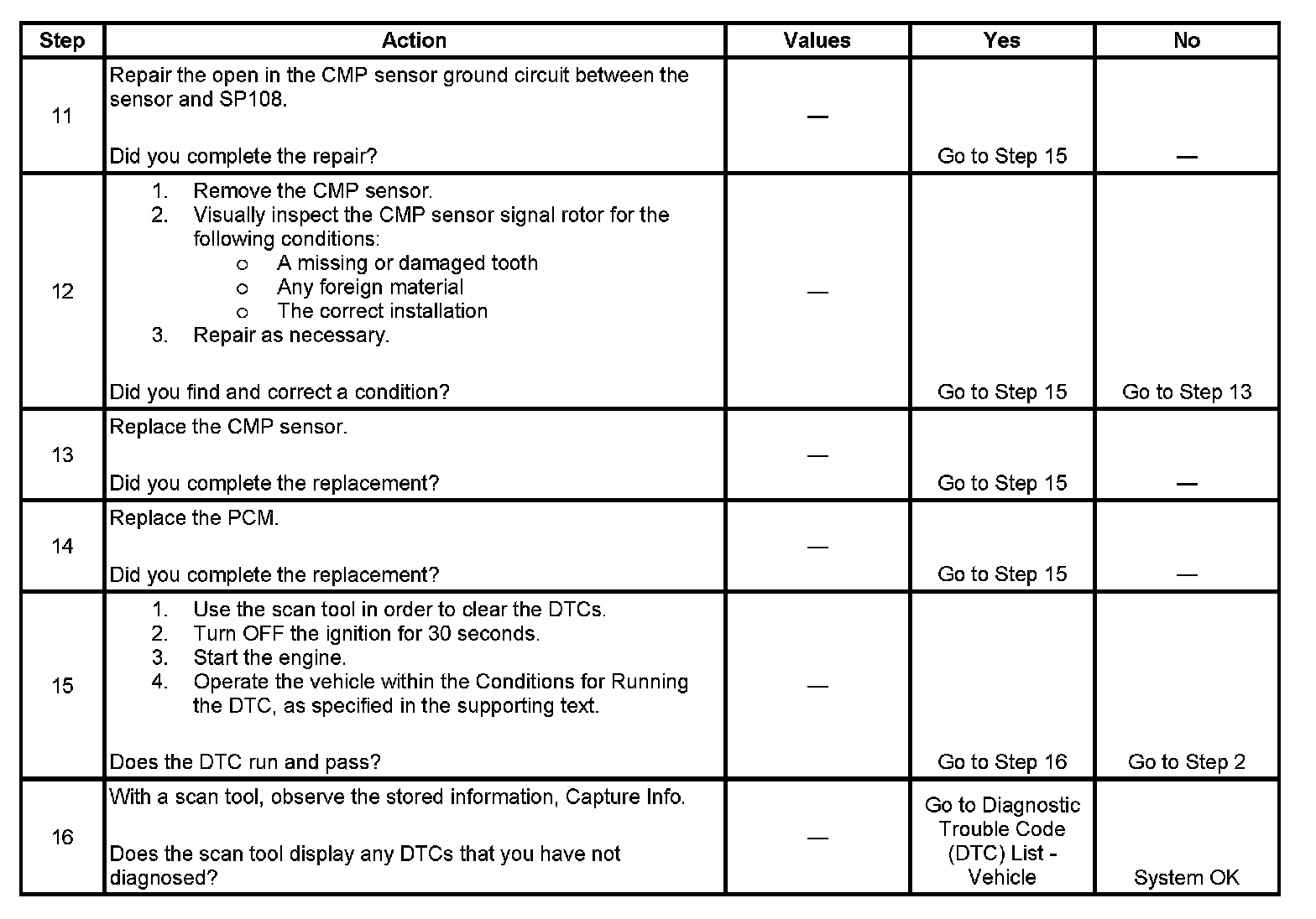 12. This step inspects for a faulty signal rotor on the camshaft. Visually inspect the tooth of the signal rotor through the CMP sensor aperture for damage, foreign material, and installation.