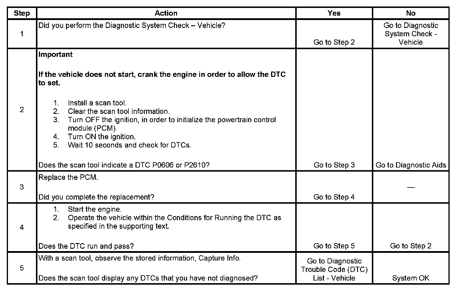 2. This step determines if the fault is present. Replace the PCM if DTC P0606 or P2610 sets again.