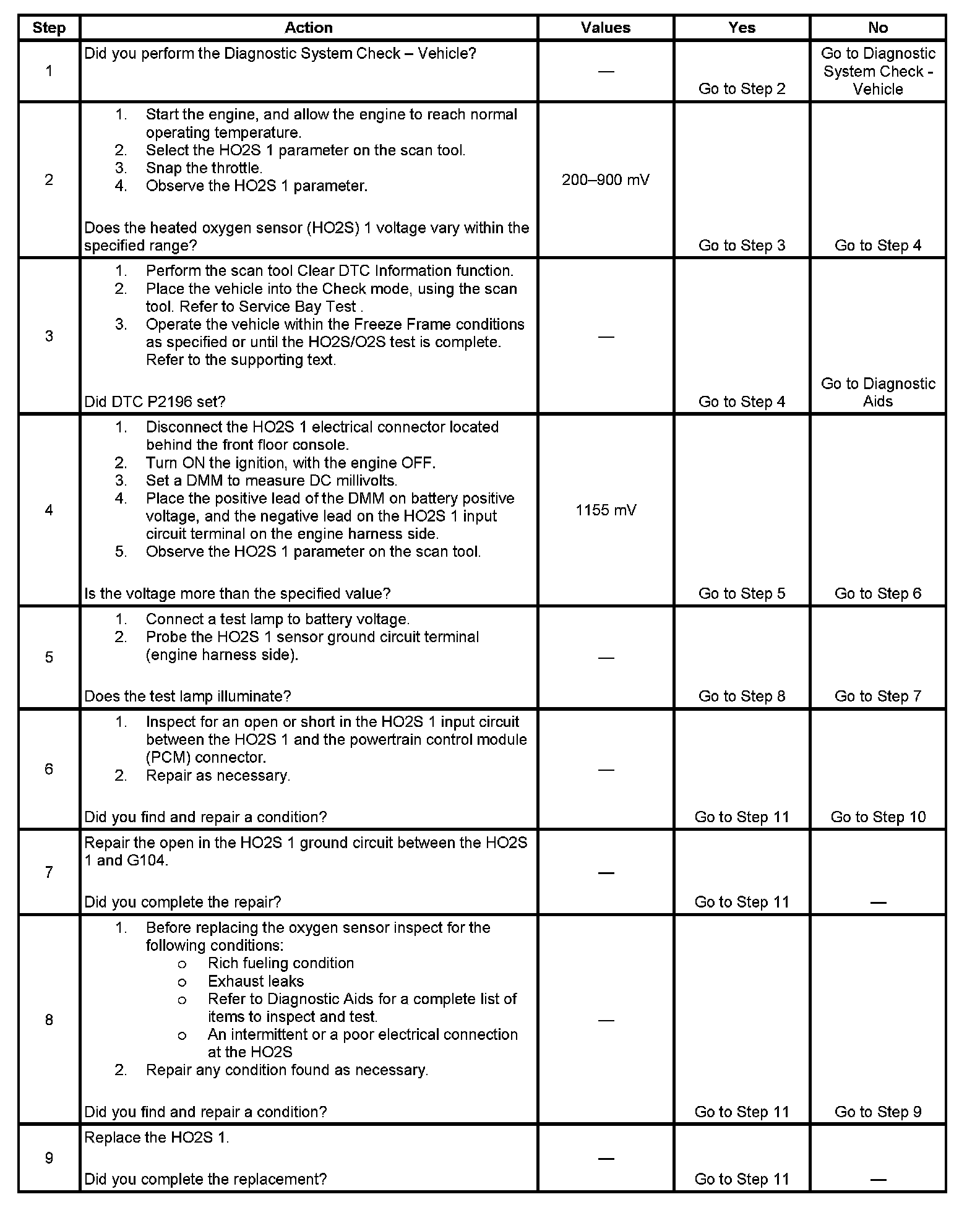 - If a DTC P2196 is intermittent, driving the vehicle under the conditions outlined in the Inspection/Maintenance (I/M) section can verify whether the fault is present. Refer to Inspection/Maintenance (I/M) Heated Oxygen Sensor/Oxygen Sensor (HO2S/O2S) System Set Procedure. Heated Oxygen Sensor/Oxygen Sensor (HO2S/O2S) System Set Procedure
