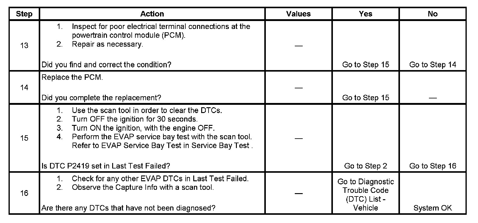 5. If you are at this diagnostic table because you were sent here from DTC P2401 or P2402, go to Step 11. If only DTC P2419 was set, go to Step 11. If you had a DTC P2401 or P2402 set with a P2419, go perform the P2401 or P2402 diagnostic procedure before continuing in this diagnostic table. P2401 P2402
