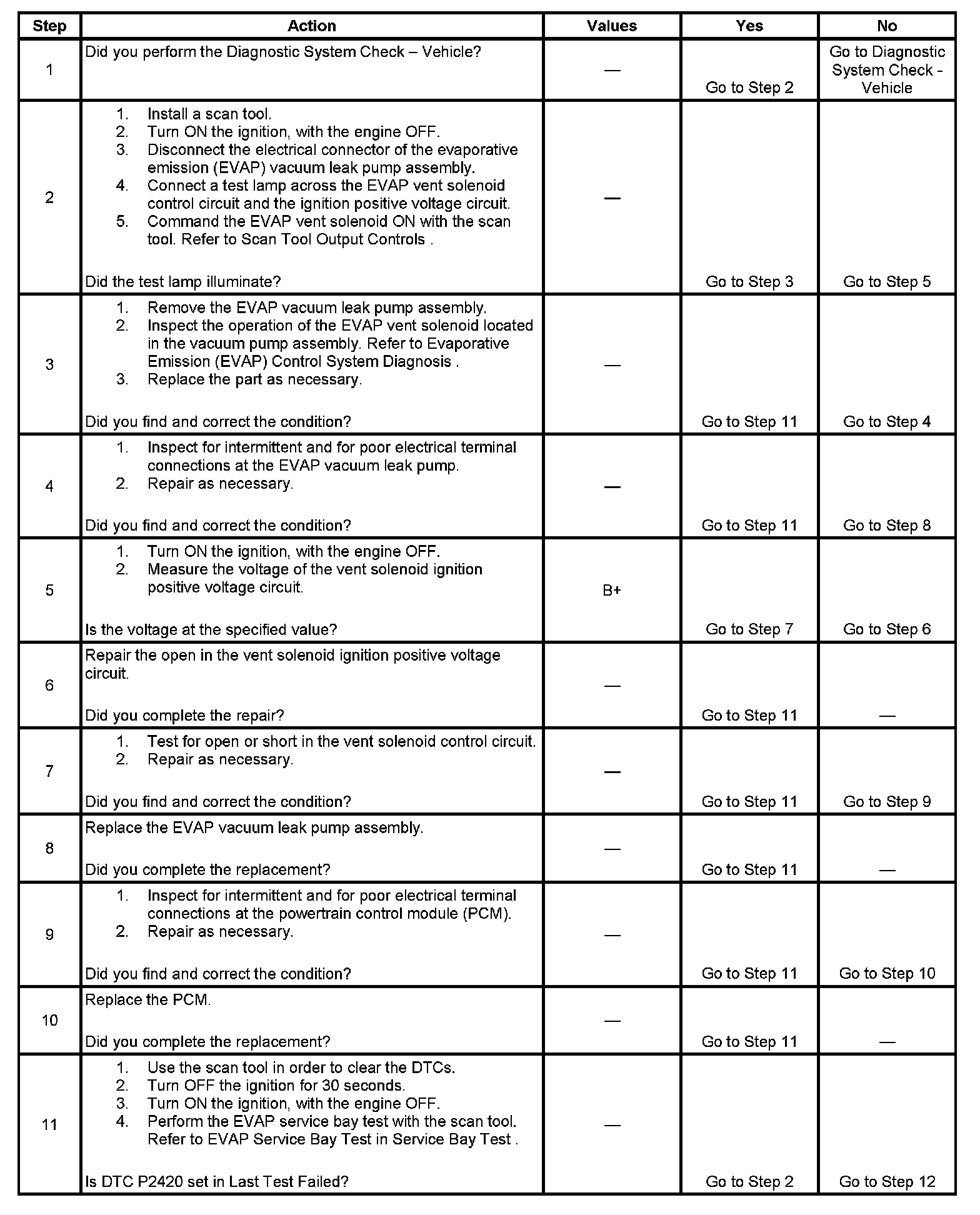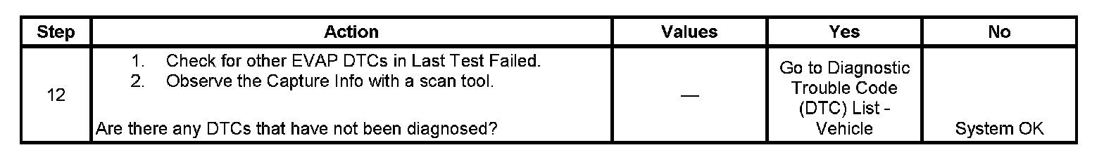11. This step uses the EVAP Service Bay test in order to verify the correct operation of the EVAP vent solenoid, the EVAP purge solenoid, and the EVAP vacuum leak pump. Using the Service Bay test also tests for leaks by sealing the system and monitoring the FTP sensor.