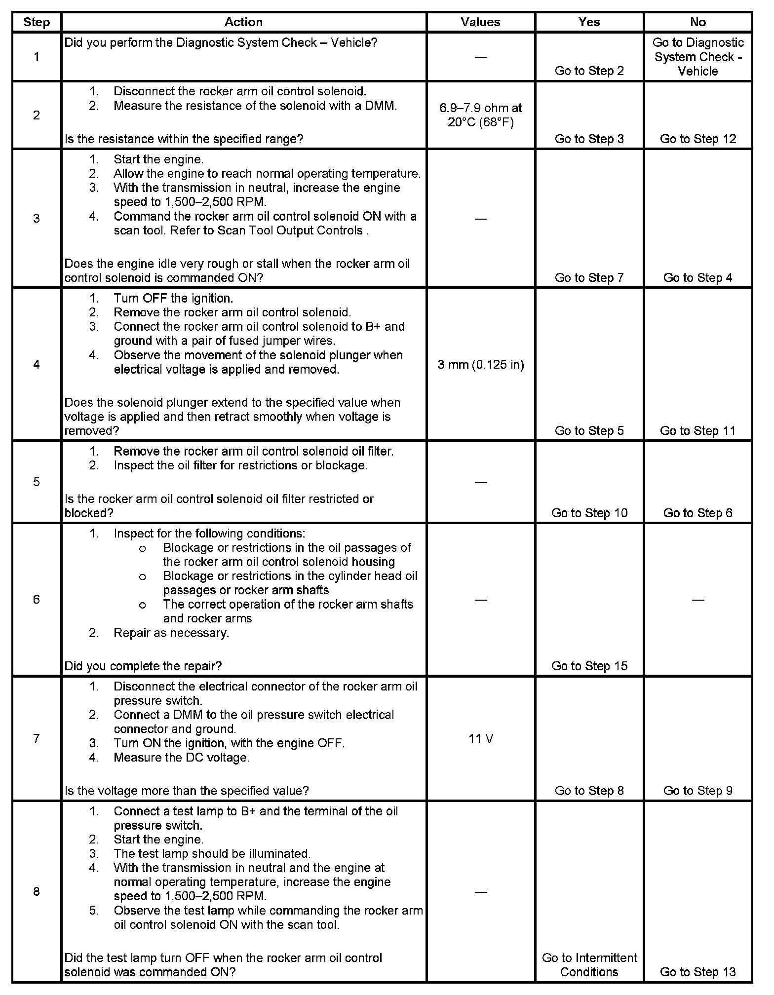 3. This step checks the operation of the rocker arm oil control solenoid. When commanded ON, the rocker arm oil control solenoid increases valve lift enough to cause the engine to run rough or to stall.