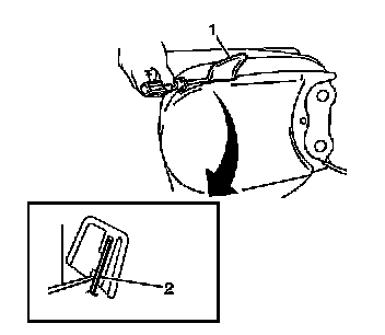 3. Using a flat-bladed tool, remove the recliner handle (1) from the front seat outboard adjuster by disengaging the retaining tab (2).