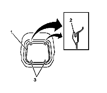 1. Using a flat-bladed tool, disengage the 2 lower plastic retainers (3) from the trim panel (1).