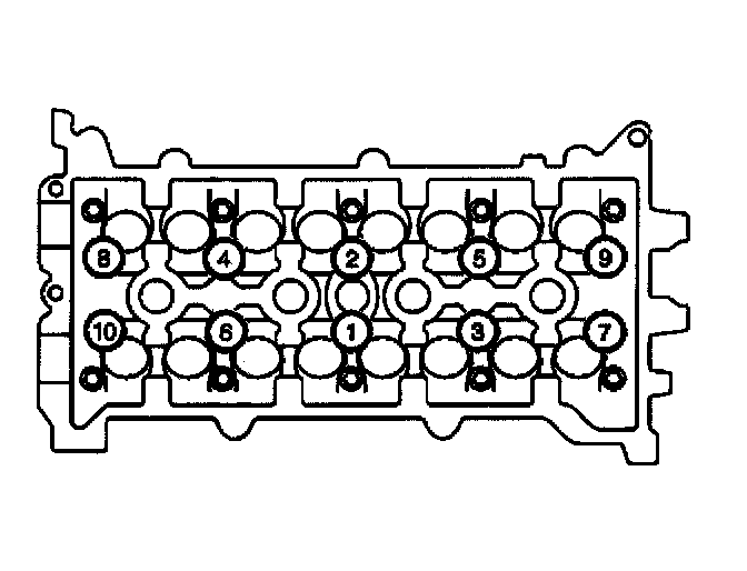 7. Progressively torque the cylinder head bolts using two steps in the sequence shown.