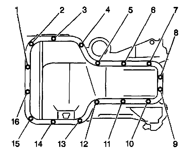1. Apply a continuous bead of silicon sealant GM P/N 12346240 (Canadian P/N 10953493) or an equivalent, to the engine oil pan mating surface.