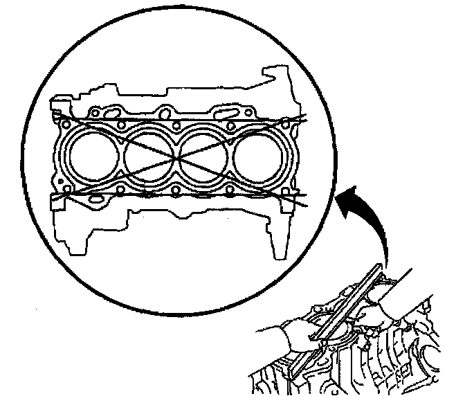 8. Use a straight edge and a feeler gage to check the deck surface for flatness. Carefully machine minor irregularities. Replace the block if warpage exceeds 0.05 mm (0.0020 inch).