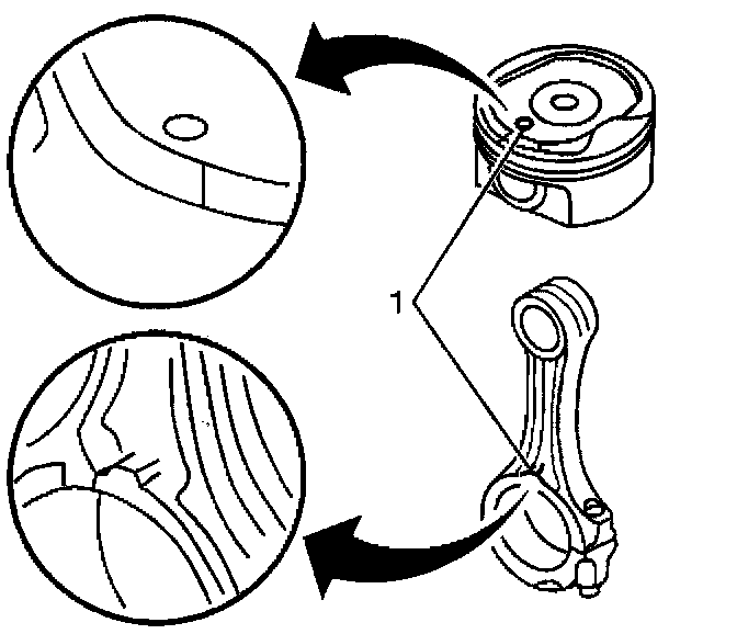 Piston and Connecting Rod AssembleImportant: Install the piston onto the connecting rod with the marks (1) oriented toward the front of the engine.