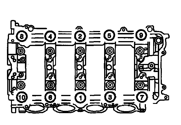 6. Progressively torque the cylinder head bolts using two steps in the sequence shown.