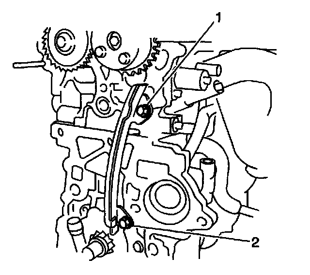 4. Install the timing chain shoe. Secure the timing: chain shoe using two bolts (1, 2).