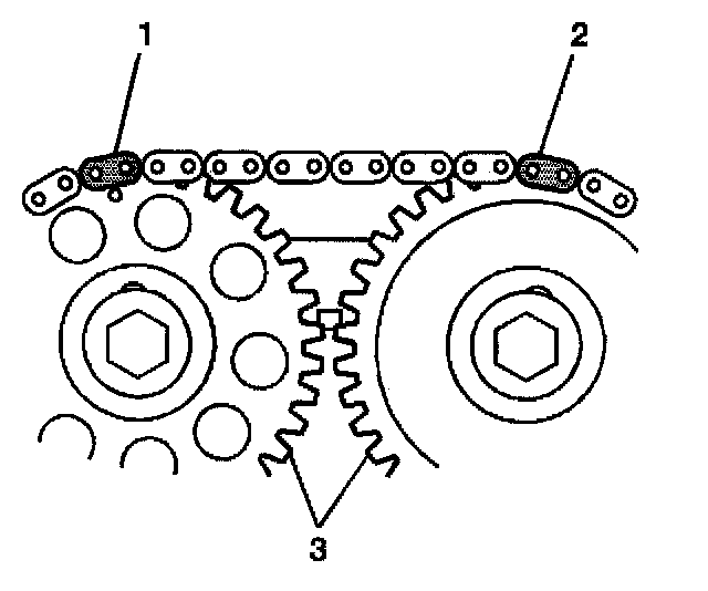 6. Install the timing chain (1) onto the camshafts timing sprockets (3).