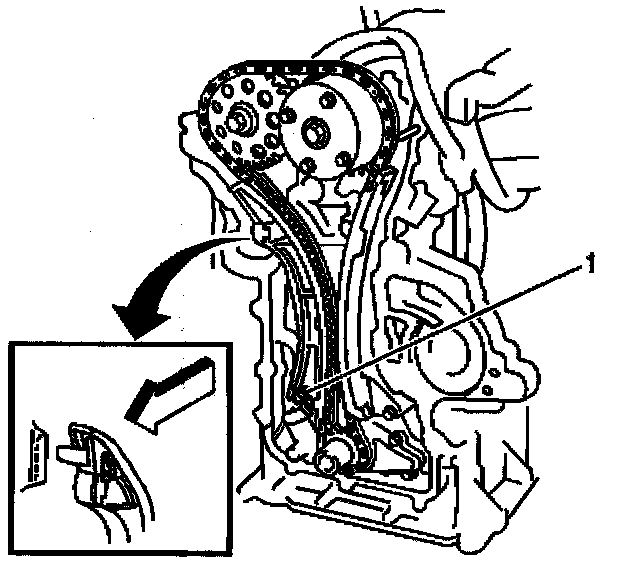 7. Install the timing chain dampener. Secure the timing chain dampener using one bolt (1).