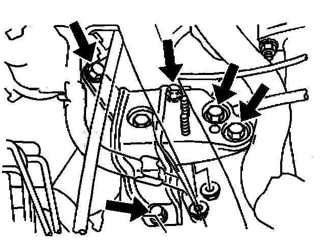 46. Remove the 5 bolts and 2 nuts from the right side engine mount.