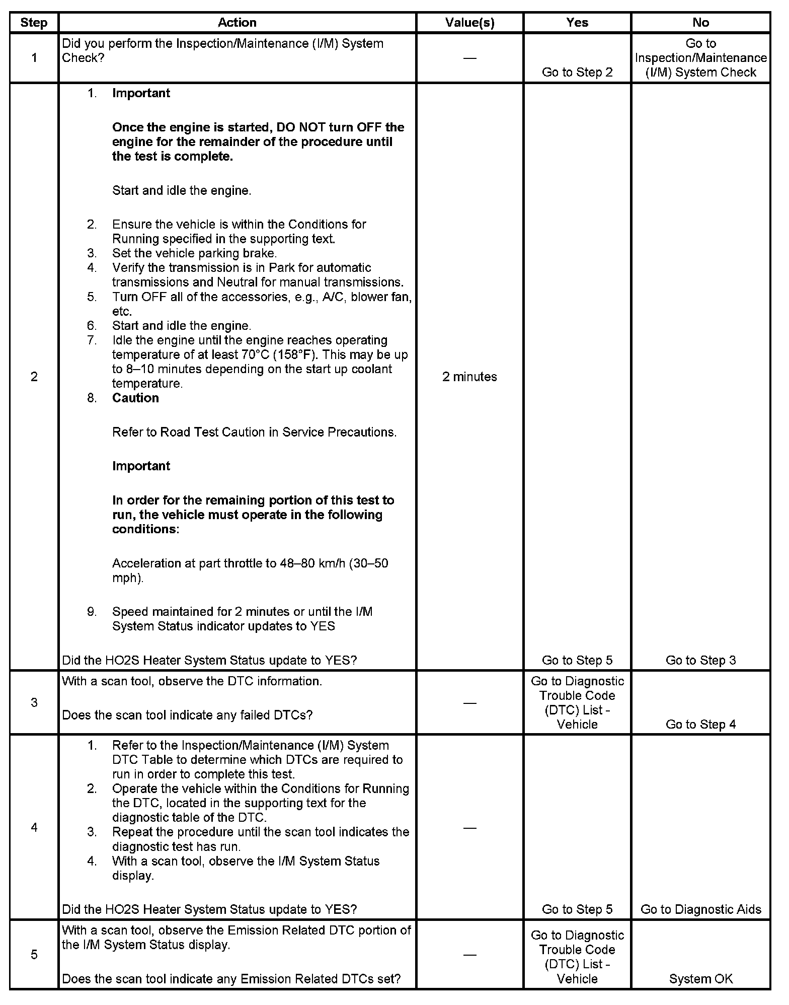 The purpose of this test is to satisfy the enable criteria necessary to execute inspection/maintenance (I/M) readiness diagnostics for the heated oxygen sensor (HO2S) system. The test may be used to set the I/M System Status to YES. Ensure the vehicle meets the requirements listed in Conditions for Running before performing this test. Failure to meet the necessary requirements may produce inaccurate test results.