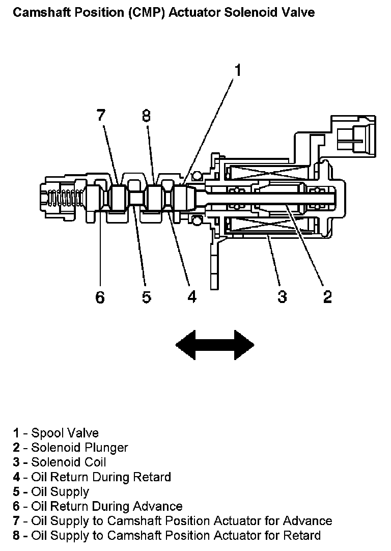 The CMP actuator solenoid valve directs the oil flow that controls the camshaft phase movement. The PCM commands the CMP solenoid to move the solenoid plunger (2) and spool valve (1) until oil flows from the advance passage (7) or the retard passage (8). In most operating conditions the opposite oil return passage is open at the same time as the oil supply passage.