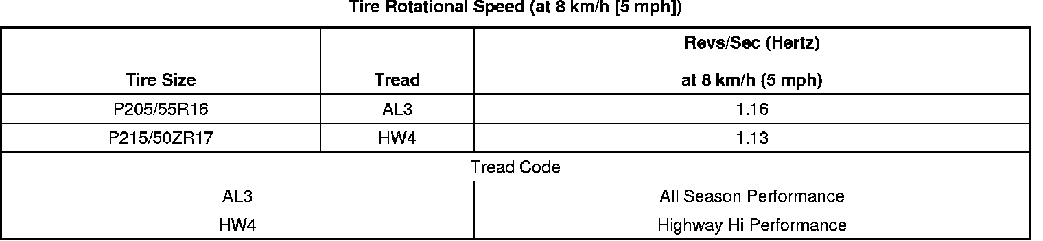 1. Determine the rotational speed of the tires in revolutions per second (RPS), or Hertz (Hz), at 8 km/h (5 mph), based on the size of the tires. Refer to the preceding Tire Rotational Speed table.