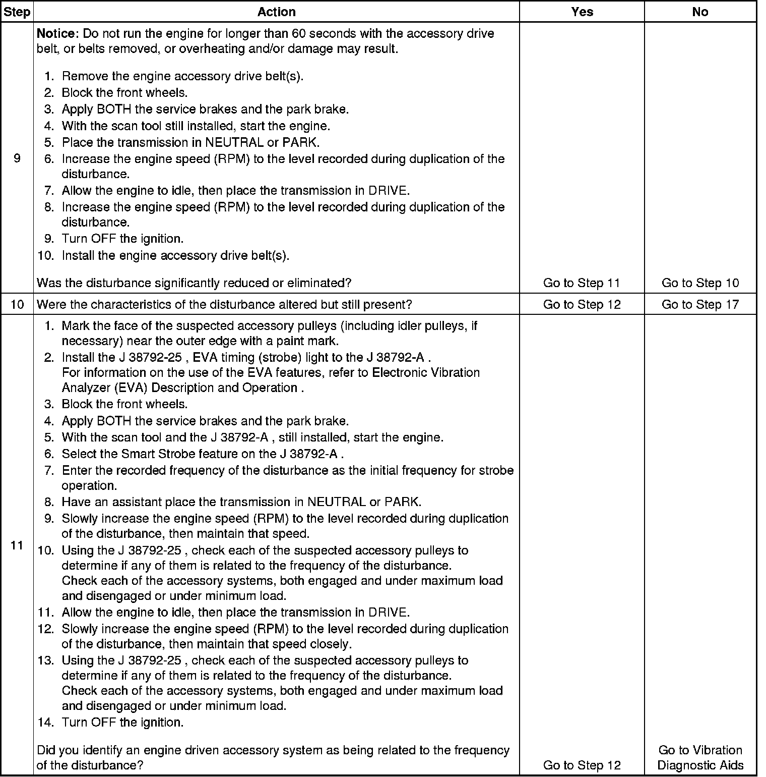 10. Non-rotating engine driven accessory components can no longer produce a unique disturbance. If a disturbance is still present, but the characteristics have been altered, it is possible that these component systems are acting as a transfer path for engine firing frequency or a first order engine disturbance.