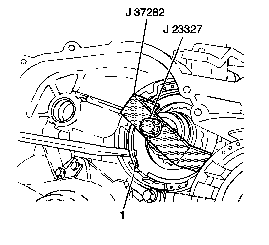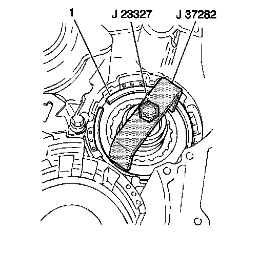 5. Install a J 23327 with a J 37282 and compress the underdrive brake piston return spring until the underdrive brake piston return spring snap ring (1) can be removed.