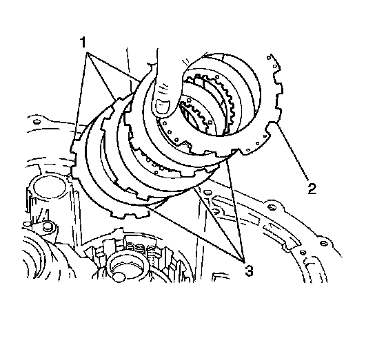 8. Remove the underdrive brake flange (2), the three plates (1) and the three discs (3) from the transaxle case.