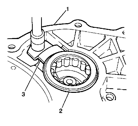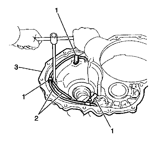 3. Remove the bolt and the countershaft front roller bearing retainer (3) from the torque converter housing (1).
