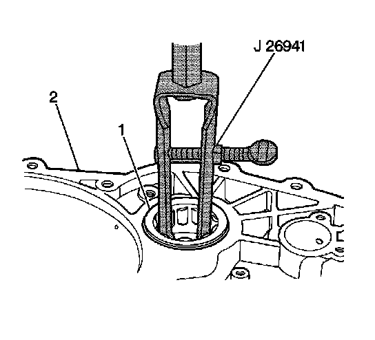 4. Use the J 26941 with a J 2619-01 in order to remove the countershaft front roller bearing (1) from the torque converter housing (2).