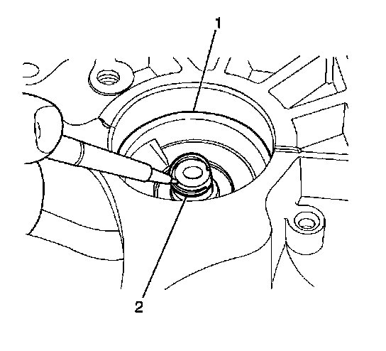 5. Remove the countershaft lubrication seal (2) from the countershaft front roller bearing bore (1).