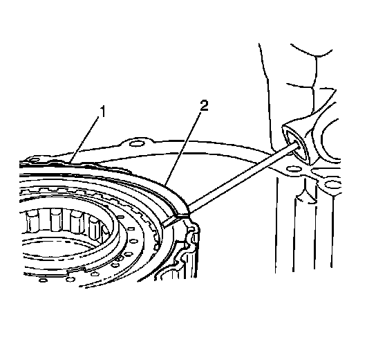 9. Use a J 23327 with a J 37279 to remove the underdrive clutch piston return spring snap ring (1) from the underdrive piston return spring (2).