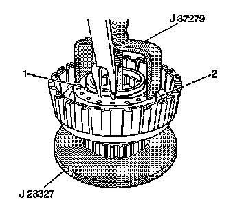 5. Use a J 23327 with a J 37279 to install the underdrive clutch piston return spring snap ring onto the underdrive piston return spring (2).