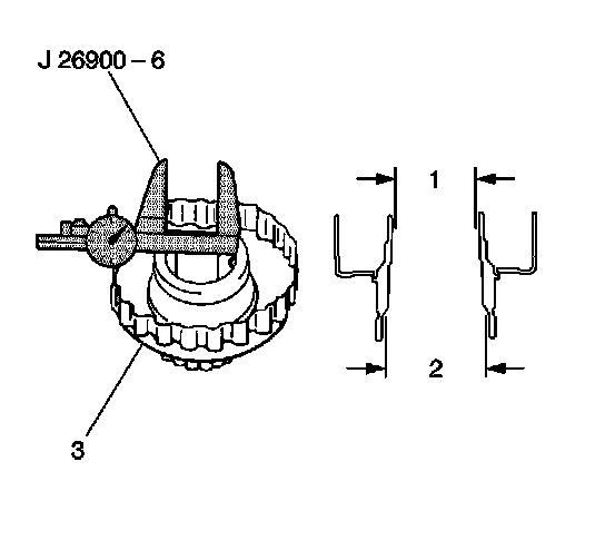19. Use a J 26900-6 to measure the inside diameter of the front and rear underdrive clutch flange (3) bushings.