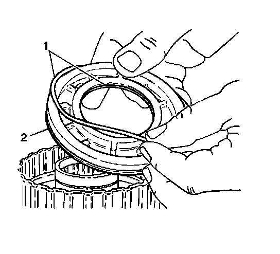 1. Install the two underdrive clutch piston seals (1) onto the underdrive clutch piston (2).