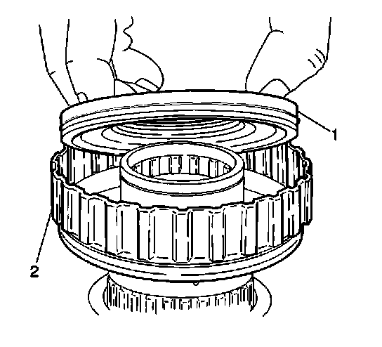3. Install the underdrive clutch piston (1) into the underdrive clutch drum (2).
