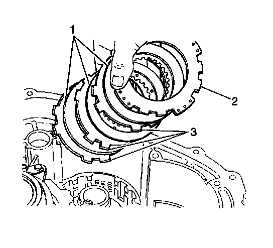 6. Install the underdrive brake flange (2), three plates (3) and three discs (1) into the transaxle case in the following order: