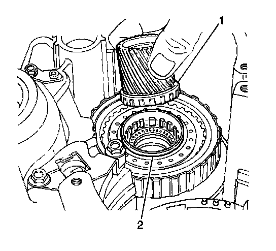 2. Install the underdrive sun gear into the underdrive thrust bearing. Install the assembly into the underdrive clutch drum (2).