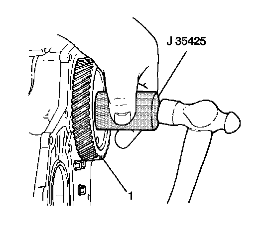 9. Install the countershaft driven gear (1) onto the countershaft using a J 35425 and a hammer while supporting the countershaft.