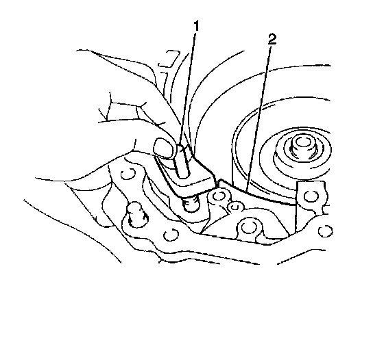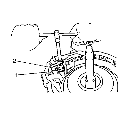 1. Install the 2nd coast brake band (2) into the transaxle case. Secure the brake band with the 2nd coast brake band anchor pin (1).