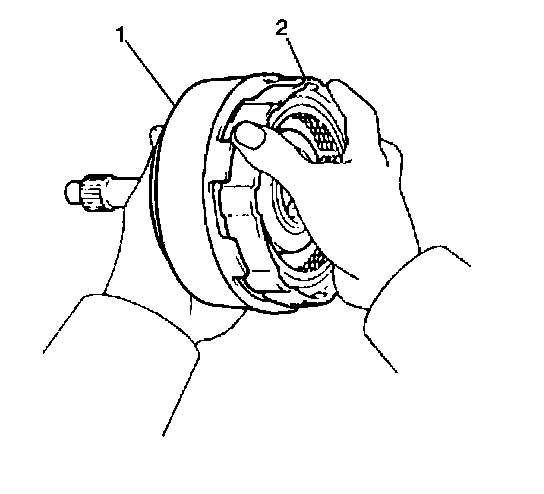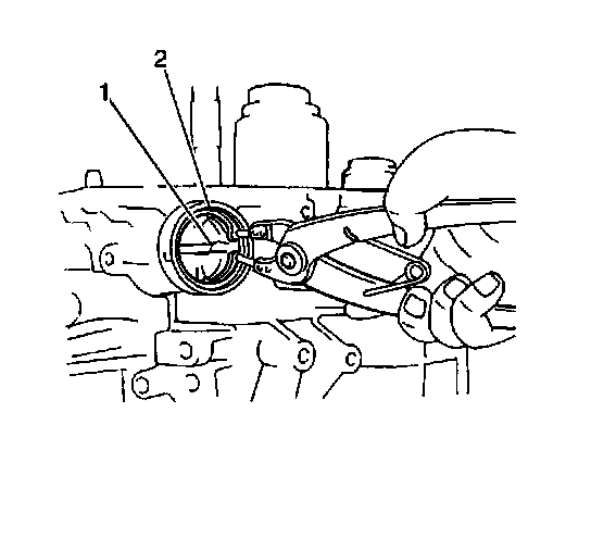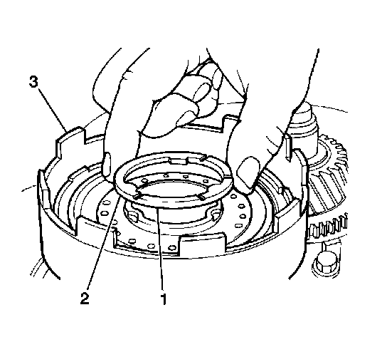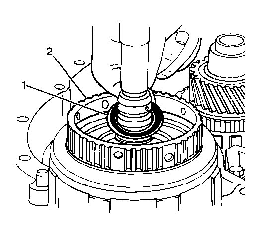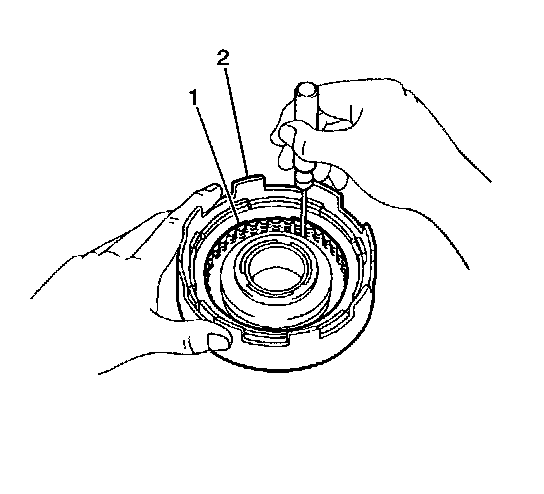 Apply J 36850 (1) to the direct clutch thrust washer (2) in order to hold it in place on the direct clutch drum.