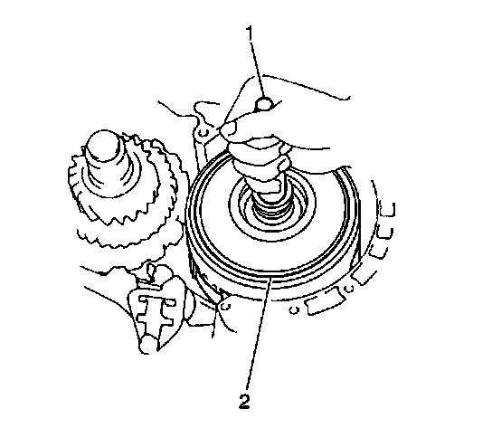 11. Install the forward and direct clutch assemblies (2) onto the front planetary ring gear by rotating the input shaft (1) back and forth until the inner teeth of the forward clutch discs mesh with the front planetary ring gear.