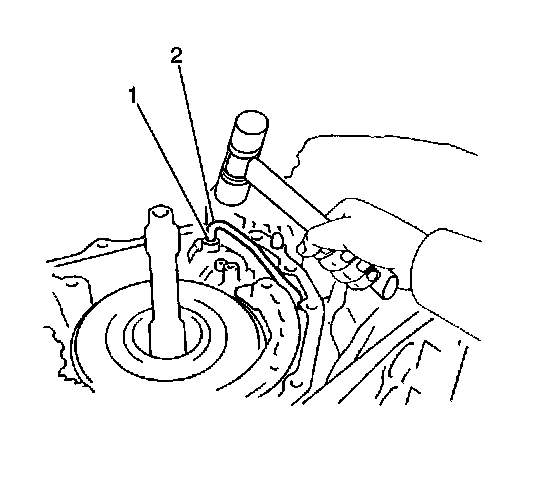 Install the 2nd coast brake apply pipe bracket (2) into the transaxle case. Secure the pipe bracket with one bolt.